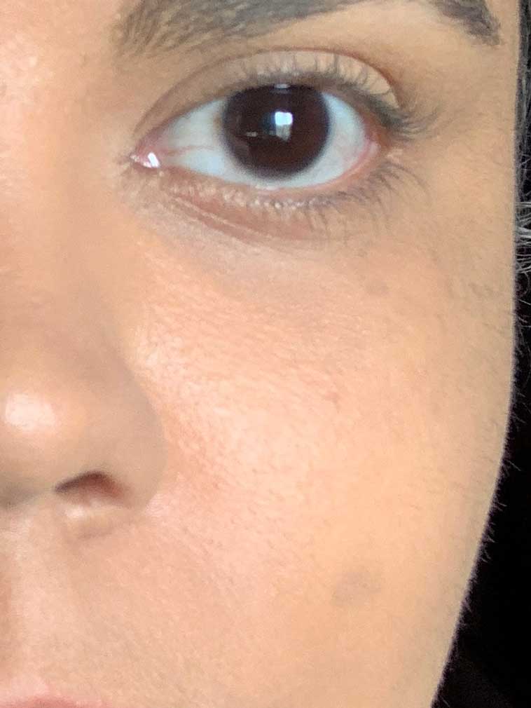 A seguir, mostrarei duas fotos que tirei uma hora após a aplicação da mistura. Hoje, fiz aplicação do pó facial apenas nas pálpebras dos olhos e nas linhas finas em baixo dos olhos, pra não acumular produto. Eu também dispensei o uso de corretivo, para não alterar a mistura.